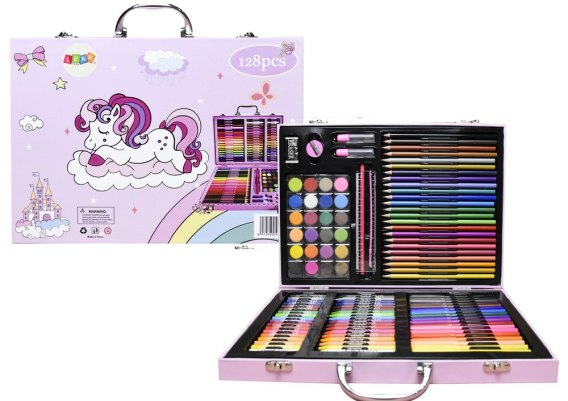Zestaw artystyczny 128 elementów w różowej walizce z motywem jednorożca zawiera wszystko, czego potrzebuje mały artysta. Idealny do rozwijania kreatywności i wyobraźni.